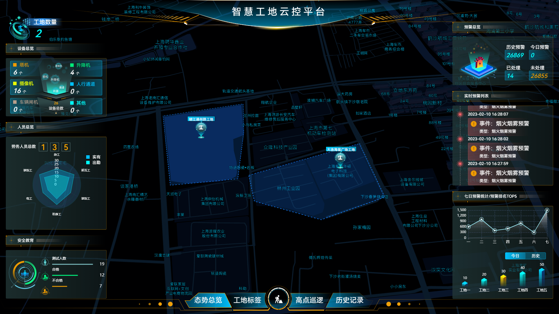 星空官网针对工地现场痛点,组织研发攻关,研发出全国领先的模块化、一体化工地综合管理平台。运用物联网技术的“感、传、知、控”,整合智能安全帽、实名制系统、环境噪音扬尘监测、安防监控、塔吊监控、升降机监控、卸料平台监控、基坑监控、临边防护、工程进度施工管理等系统,为政府部门、施工单位、租赁企业、设备生产厂家、建设部门提供了完整的智能管理和服务。