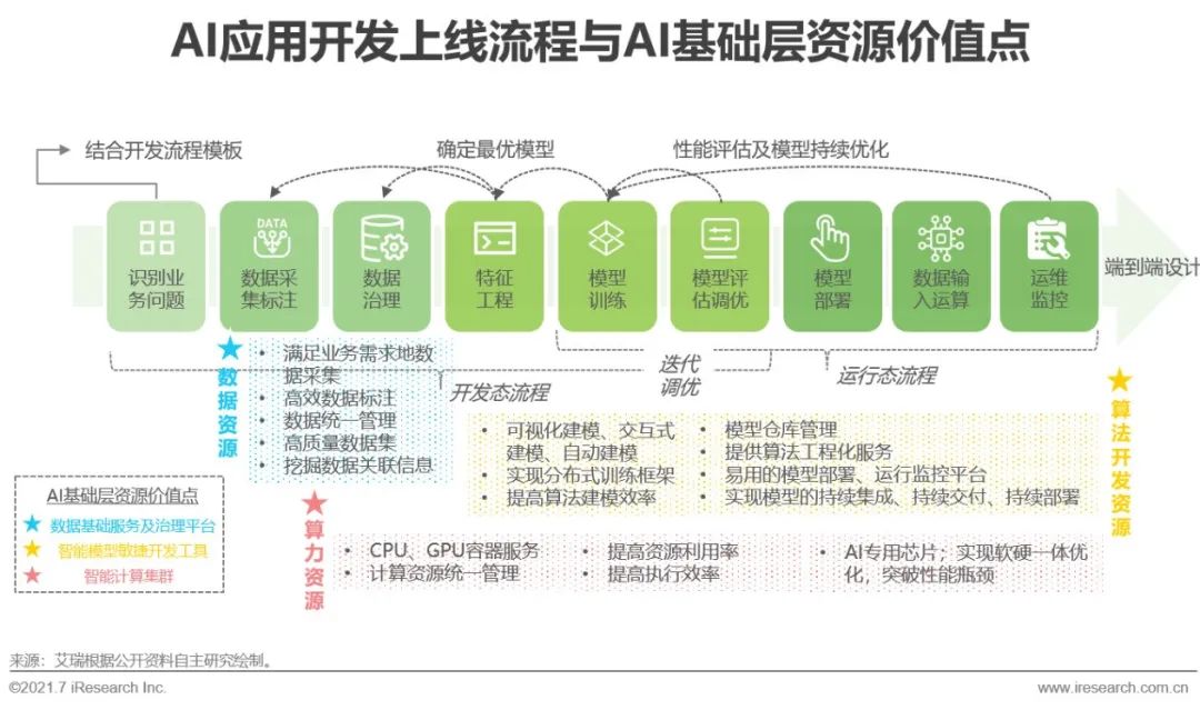 根据艾瑞2020年执行的CTO调研,2019年超过51%的样本企业AI相关研发费用占总研发费用比重在10%以上,2020年65.9%的企业AI研发占比达到10%以上。一方面是甲方企业不断增长的对智能化转型的强劲需求,一方面则是在AI应用开发与部署过程中企业普遍面临的数据质量(49%)、技术人才(51%)等基础资源配置难点。且目前只有少数企业可以完成AI项目实施前设定的全部投资回报率(ROI)标准,因此甲方企业在投资AI项目时相对审慎。AI基础层资源则可有效缓解甲方利用AI技术重塑自身业务时的投资矛盾,提升模型生产效率,降低部署成本:数据资源集群具备数据采标与数据治理能力,且一站式的数据平台可对实时数据进行统一管理,提高数据利用率;高效的AI算力集群与调度系统可满足模型训练与推理需求,降低总拥有成本(TCO,TotalCost of Ownership);基于算法开发平台演化出的语音识别、计算机视觉、机器学习等专业的AI模型生产平台,可提供高效、一站式的AI模型生产服务。