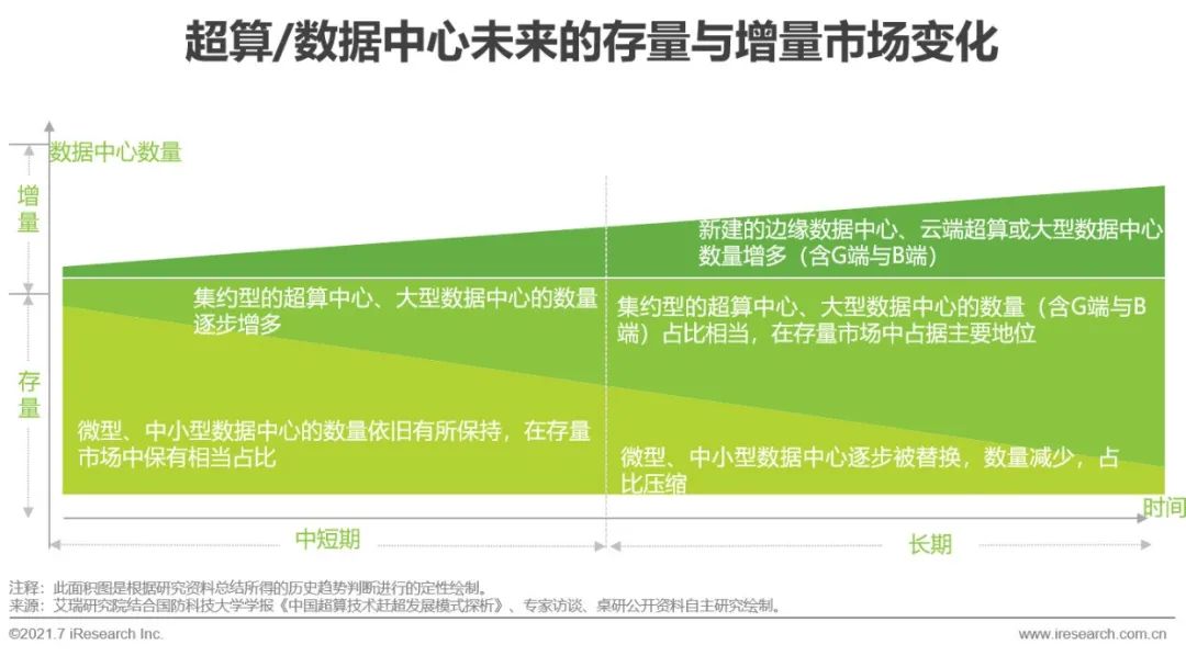 从市场变化趋势来看:1)存量市场:日渐增加的AI计算负载需要处理力更强、能耗承受度更大的数据中心,同时,一系列有关控制数据中心PUE值的节能审查规定相继出台,一味盲目扩建、新建数据中心已难合时宜,促进老旧数据中心绿色化改造的减量替代方案因此诞生。微型、中小型数据中心会逐渐被改造为集约型的大型数据中心,符合节能减排相关标准、机柜数量与异构组合增多的集约型超算/数据中心将在存量市场中占据主流。2)增量市场:考虑到边缘计算可分担AI计算任务、兼具低延时优势,管理边缘计算中心则需要布局相应的大型云端数据中心,故增量市场会被异构的边缘计算数据中心与云端超算或大型数据中心扩充。
